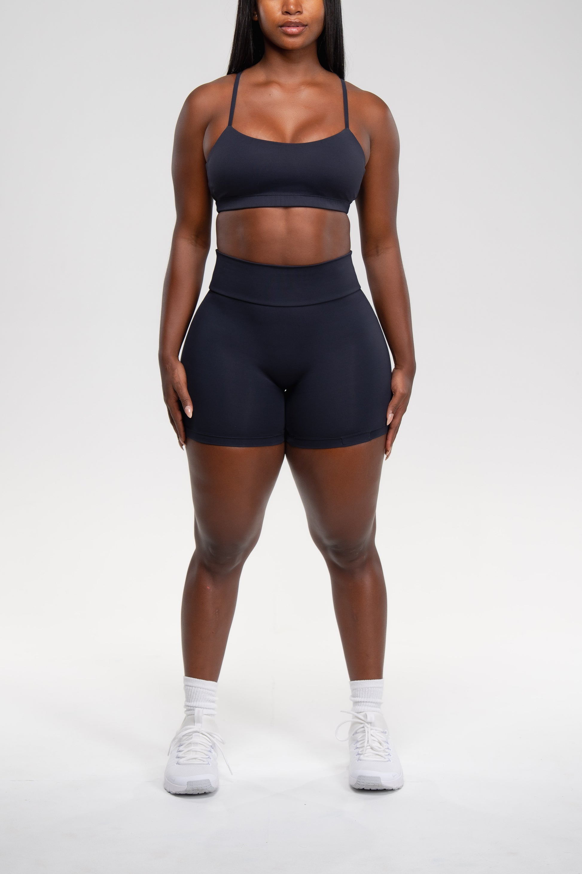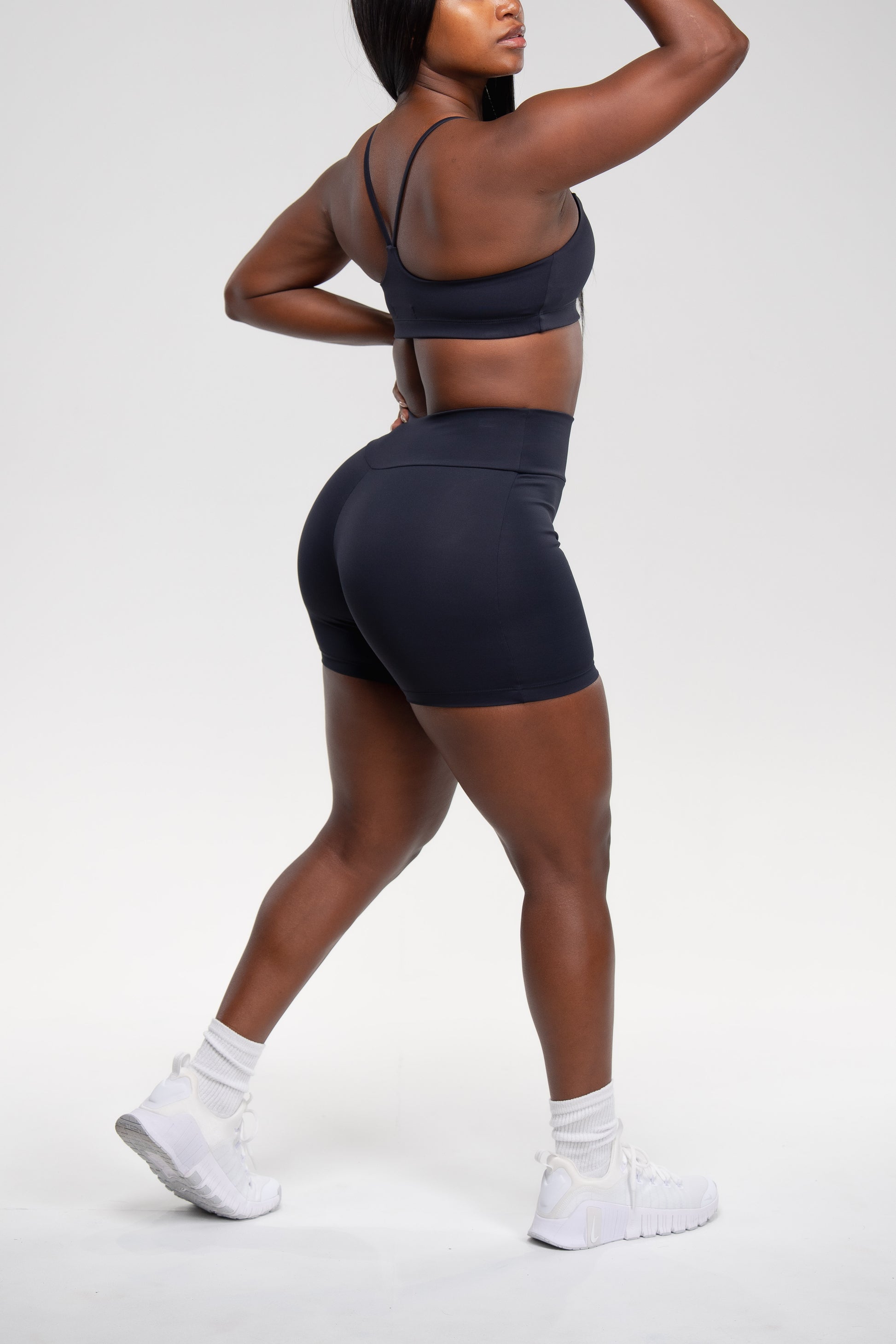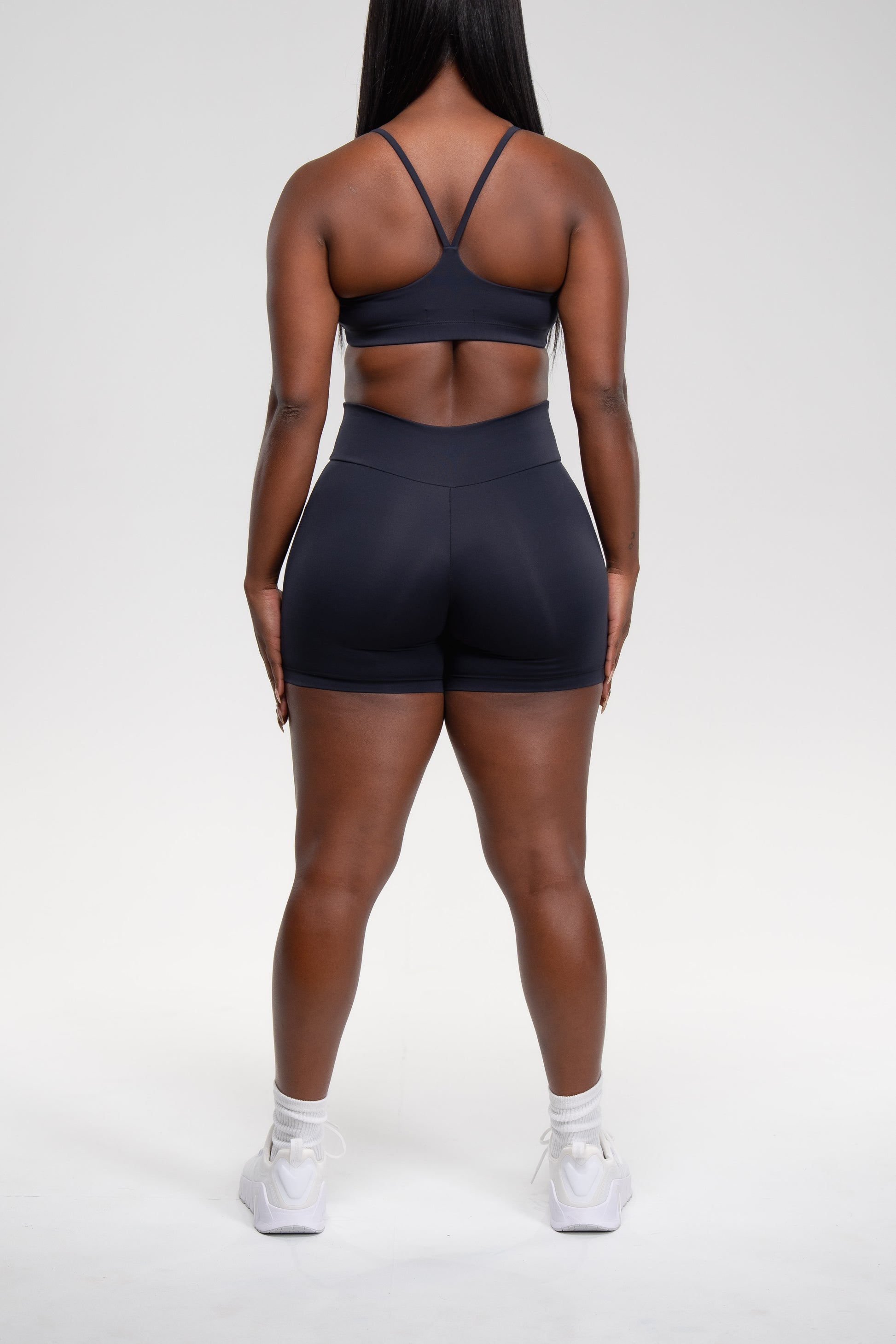 IRON - FORM in EMANA® A deep, smoky black that feels powerful and refined in IRON. FORM debuts a shorts set with a seamless, second skin fit designed for movement: featuring a scoop neck top with thinner straps that meet in a slight V at the back, paired with shorts crafted without front seams for a smooth, streamlined silhouette. Crafted with EMANA® smart fabric, this set feels silky and breathable while working with your body. The Brazilian bioactive technology boosts circulation, helps improve skin elasticity, and over time can reduce the appearance of cellulite.