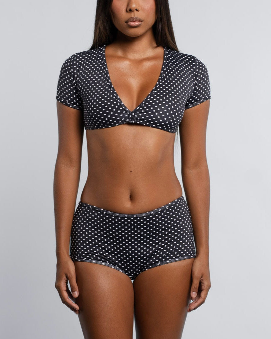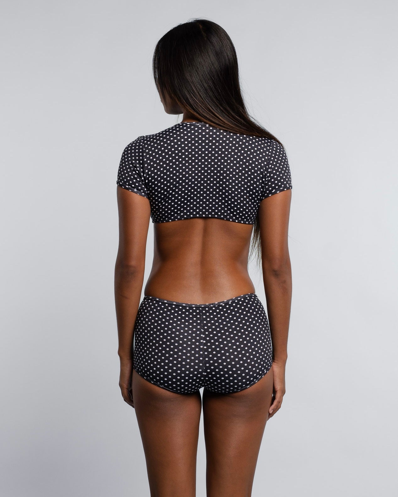 Playful polka meets a sporty-rich look. Dottie is made with our classic lycra - smooth, supportive, with a firm fit. Features low-rise mini shorts with a seamless front for comfort, paired with a perfectly cropped top that offers just the right amount of hold.