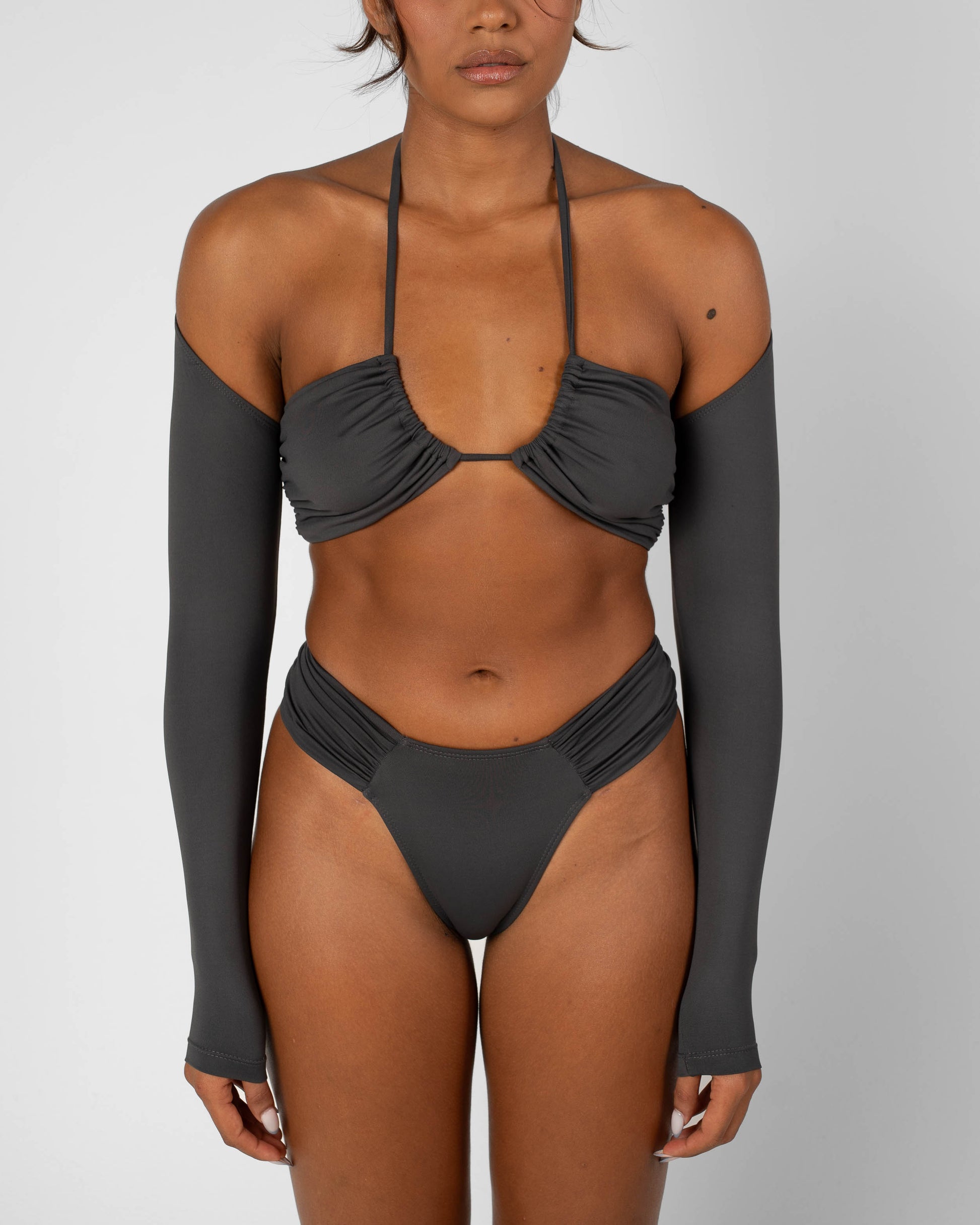 Made with multifaceted ties at the neck for a supportive and versatile look. This supportive style hugs your figure and holds where it counts. Includes an off the shoulder bolero for added coverage and effortless style.