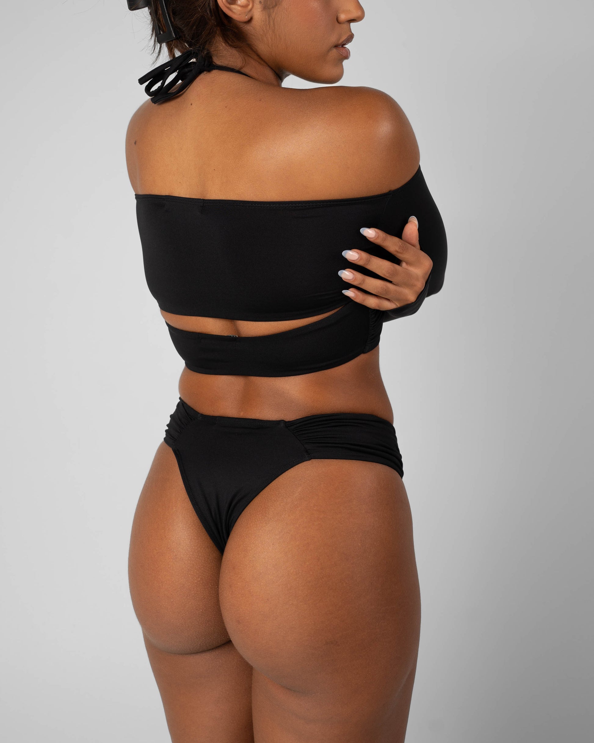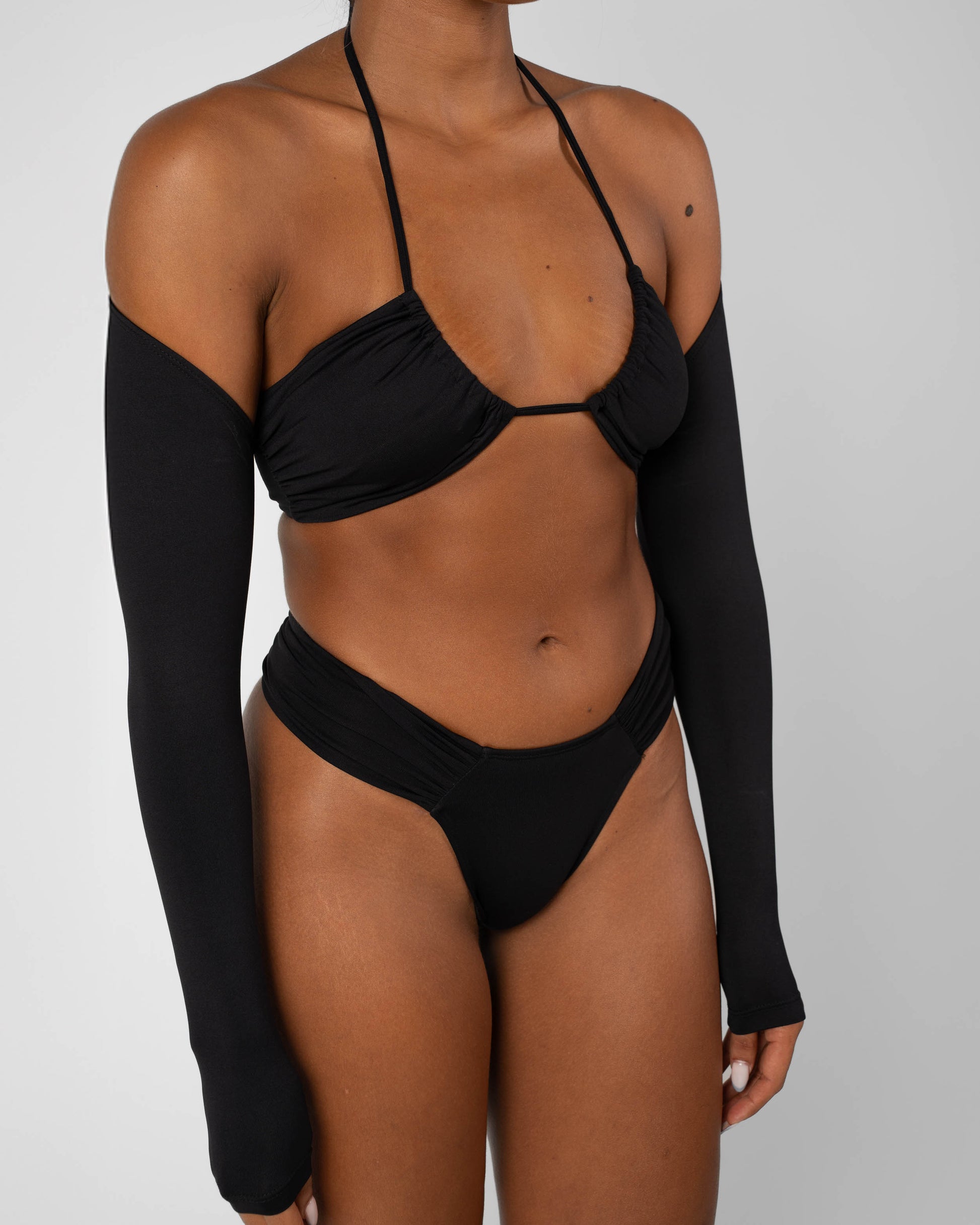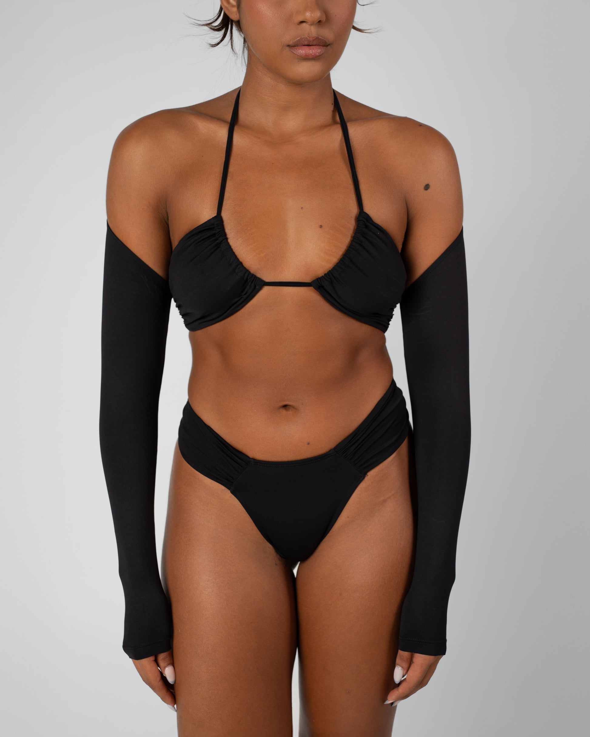 Made with multifaceted ties at the neck for a supportive and versatile look. This supportive style hugs your figure and holds where it counts. Includes an off the shoulder bolero for added coverage and effortless style.