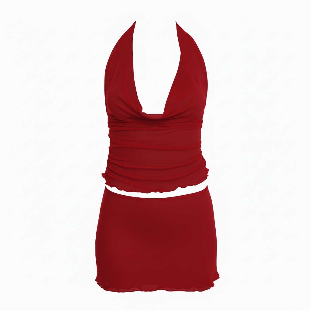 FLIRT Airy mesh meets an effortlessly flirty look. The Mesh Set is made with our Tule fabric - soft, stretchy mesh that's breathable and easy to wear. A halter top with a plunged neckline and cinched waist, finished with overlocked borders that softly curl. Paired with a low rise mini skirt with the same playful finish. Finished with double lining for just the right about of coverage, wear it with pasties or over your favorite swimsuit.